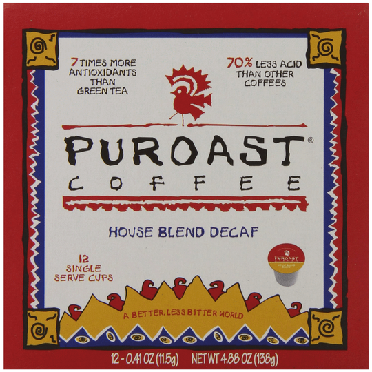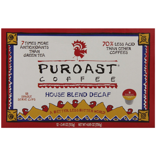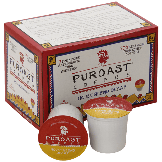 PUROAST LOW ACID COFFEE SINGLE SERVE KEURIG COMPATIBLE DECAFFEINATED HOUSE BLEND 12 COUNT